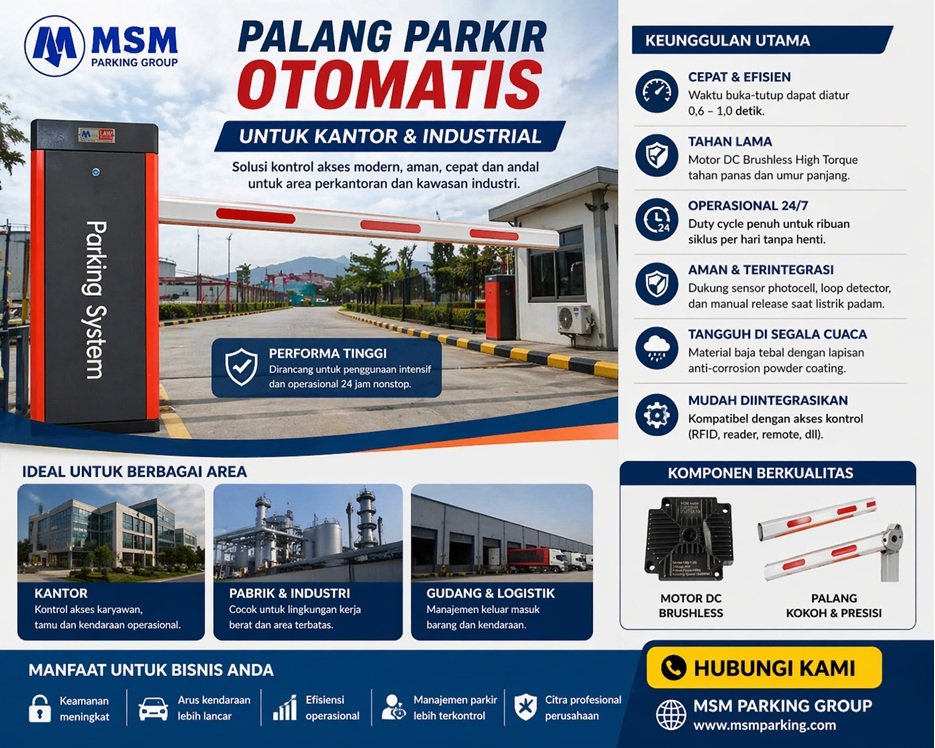 M Gate merupakan salah satu merek palang parkir yang populer di Indonesia, dikenal karena ketangguhannya dalam menangani beban kerja berat (heavy duty) dan kemampuannya untuk diintegrasikan dengan berbagai sistem akses digital.