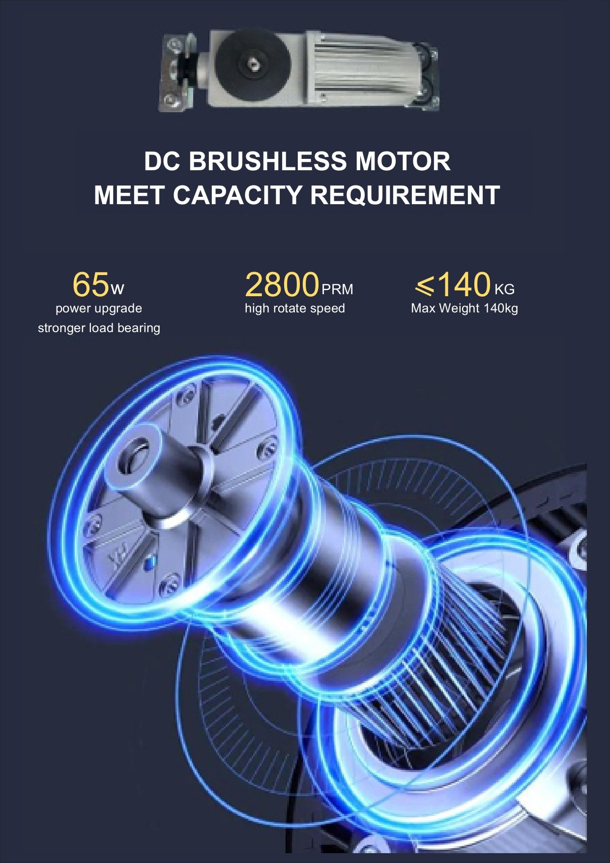 Menggunakan motor DC brushless 24V 65W dengan kecepatan 2800 RPM, memberikan performa stabil, umur pakai panjang, serta perawatan minimal. Kapasitas beban pintu hingga 140 kg (single) atau 2×130 kg (double)